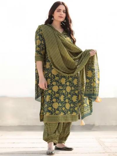 फ्लोरल प्रिंट खूपच ट्रेंडी आणि व्हायब्रंट दिसतो. यासाठी आपण कॉटनमध्ये फ्लोरल प्रिंट अफगाणी सूट खरेदी करू शकता. मेहेंदी रंगाचा ड्रेस प्रत्येक त्वचेच्या टोनवर सुंदर दिसतो.