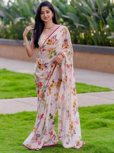 फ्लोरल प्रिंटेड जॉर्जेट साडी ही वजनाला हलकी असते. त्यामुळे या दिवसभर नेसून ऑफिसमध्ये काम करता येते. यावर फुलांच्या प्रिंट्स असतील तर लूक प्रोफेशनल दिसतो.