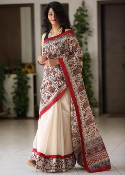 एथनिक आणि रॉयल लूक हवा असेल, तर कलमकारी प्रिंट साडी निवडा. कॉटन किंवा सिंथेटिक कॉटनमध्ये मिळतात. पारंपारिक डिझाईन्स आपल्या चांगला लूक देतात.