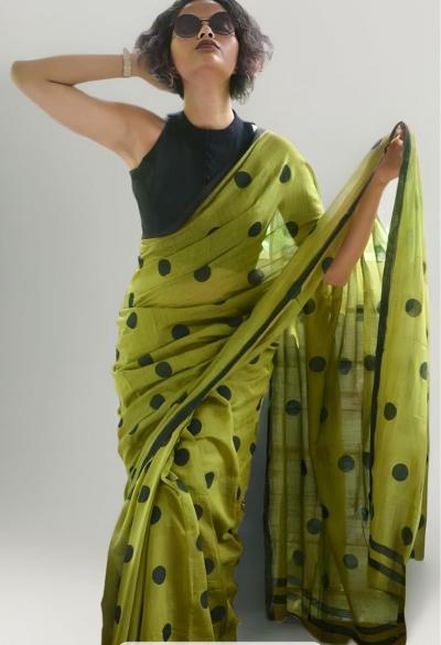 पोलका डॉट्स प्रिंट साड्या या अधिक स्टायलिश दिसतात. काळ्या-पांढऱ्या किंवा निळ्या-पांढऱ्या रंगातील पोलका डॉट्स साड्या प्रोफेशनल मीटिंग्ससाठी चांगल्या असतात.