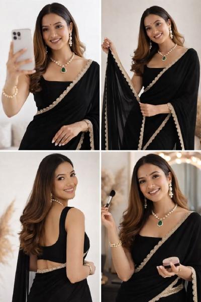 जेव्हा वजन थोडे जास्त असते आणि आपल्याला झटपट 'स्लिमिंग इफेक्ट' हवा असतो, तेव्हा डोळे झाकून निवडता येणारा रंग म्हणजे काळा. हा असा रंग आहे जो कधीच आऊट ऑफ फॅशन जातं नाही आणि प्रत्येक महिलेच्या वॉर्डरोबमध्ये किमान एक तरी काळी साडी असायलाच हवी. जर तुम्हाला अधिक बारीक दिसायचे असेल, तर जॉर्जेट, शिफॉन किंवा नेटची काळी साडी निवडा. काळ्या रंगात सॅटीन देखील खूप ग्लॅमरस दिसते कारण ते शरीराला व्यवस्थित आकार देते.पूर्ण काळी प्लेन साडी आणि त्यावर एखादे डिझाइनर ब्लाउज तुम्हाला खूप उंच आणि स्लिम दाखवते.