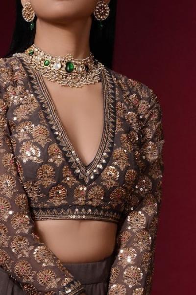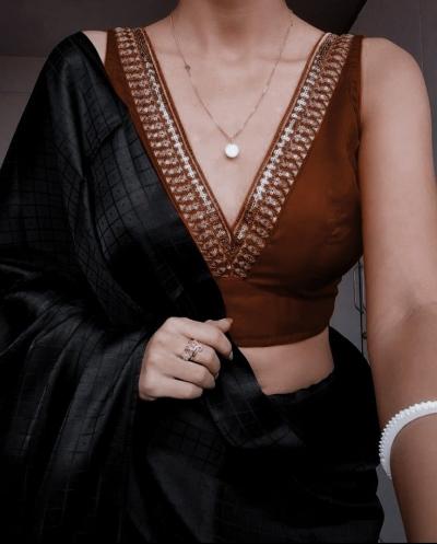 एम्बेलिश्ड V-नेक हा सीक्विन, मोती किंवा झरीच्या साडीवर शोभून दिसतो. हा ब्लाऊज कोणत्याही पार्टी लुकला रॉयल टच देतो.