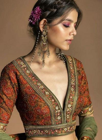 क्लासिक डीप व्ही नेक ब्लाऊज हा पॅटर्न साडी असो वा लेहेंगा. यावर हे ग्रेसफुल, एलिगंट दिसते. फ्रंट V कटमध्ये बॉर्डर दिली की लुक अजून उठून दिसतो.