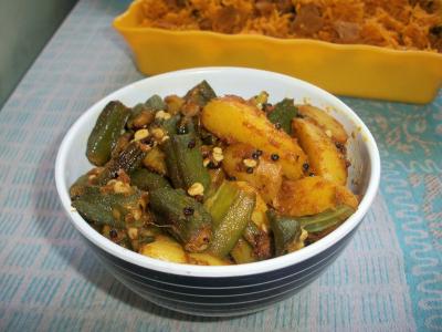 भेंडी बटाटा साधी, सिंपल मात्र जिभेला आवडेल अशी रेसिपी आहे. कांदा परतून घ्यायचा, बटाटे परतायचे भेंडी परतायची आणि अगदी मोजके मसाले घालून छान वाफवायची. ऑफीसला जाणाऱ्यांच्या डब्यासाठी अगदी मस्त रेसिपी आहे.