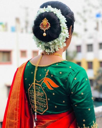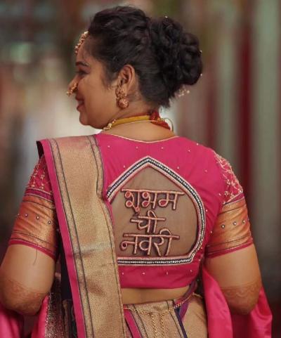 ब्लाऊजच्या मागच्या भागात तुम्ही तुमच्या आवडीनुसार 'सुखी भव', शुभ लग्न' किंवा एखादा चांगला श्लोक किंवा वाक्य लिहून त्यावर जरतारी एम्ब्रॉयडरी केल्यास ब्लाऊज व साडी अगदी उठून दिसते.