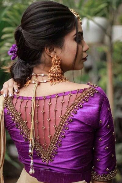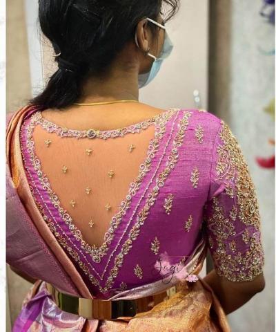 ब्लाऊजच्या मागचा गळा त्रिकोणी शिवून तुम्ही हवीतशी हेवी डिजाईन बनवून घेऊ शकता.