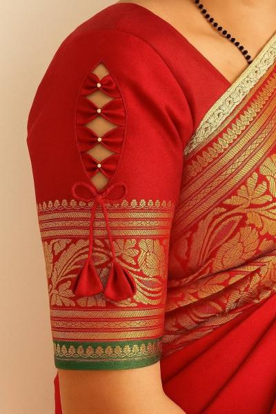 वरच्या बाजूला डिझाईन्स आणि खालच्या बाजूला बॉर्डर किंवा गोंडे लावलेला हा प्रकार सिल्क साड्यांवर उठून दिसतो. (New Patterns Of Blouse Sleeves)