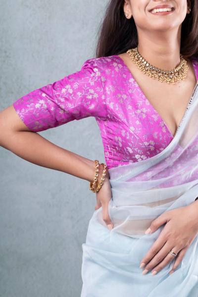 ब्लाऊजची फिटींग फार महत्वाची असते. दंड बारीक असल्यामुळे ब्लाऊज सैल न ठेवता तो शरीराच्या मापाप्रमाणे अगदी अचूक असावा. (Unique Blouse designs)