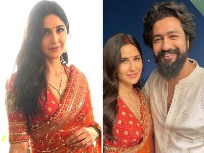 कतरिनाने तिच्या लग्नानंतरच्या पहिल्या करवा चौथं सणाला लाल आणि गुलाबी रंगाचे मिश्रण असणारी धूप - छाव प्रकारातील ऑरगेंझा साडी नेसली होती. तिचा सिम्पल पण एलिगंट मेकअप खूपच सुंदर दिसत आहे, जो तिच्या चेहऱ्यावरील नैसर्गिक सौंदर्याला उठाव देतो.