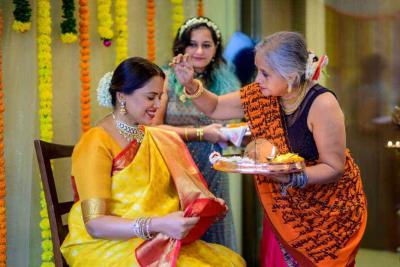 ६. अभिनेत्री समीरा रेड्डी हिचं तिच्या दुसऱ्या मुलीच्या वेळीही डोहाळेजेवण झालं होतं. या कार्यक्रमासाठी तिने पिवळ्या- गुलाबी रंगाचं कॉम्बिनेशन असणारी खास कांजीवरम साडी नेसली होती.