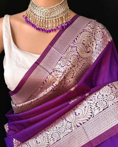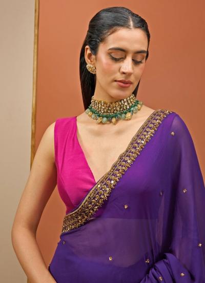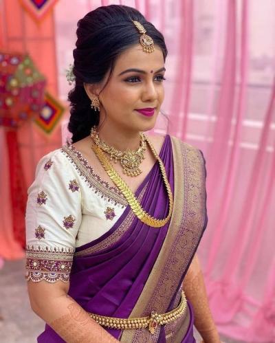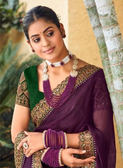 डार्क हिरव्या रंगाचं ब्लाऊजसुद्धा जांभळ्या साडीवर उठून दिसतं.