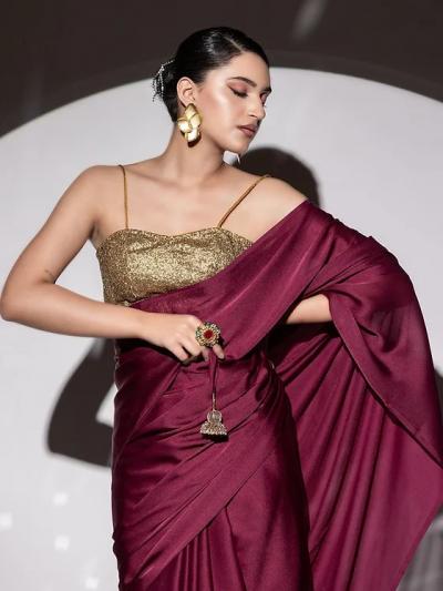 शिमर गोल्डन ब्लाऊज तुम्ही कोणत्याही डार्क वांगी रंगाच्या साडीवर घालू शकता.