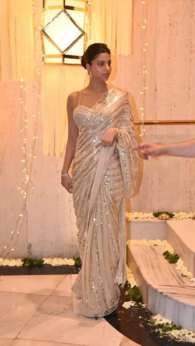 सुहाना खान नेहमीच चर्चेत असते. यावेळी ती गोल्डन ब्लाऊज आणि गोल्डन पॅचेचच्या साडीवर दिसून आली.