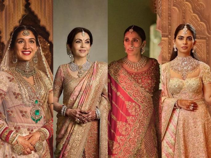 1 / 5लग्नसोहळ्याप्रसंगी राधिका मर्चंटने हा सुंदर लेहेंगा घातला होता. गुजराती परंपरेनुसार नवरी लग्नात पनेतर साडी नेसते. त्यानुसारच या लेहेंग्याचं डिझाईन केलं होतं. यावर तिने टिशू सिल्कची ओढणी घेतली होती आणि संपूर्ण लेहेंग्यावर वेगवेगळे स्टोन, सेक्विन, तांबा टिक्की लावून रेशमाने भरगच्च जरीकाम केलेलं होतं. तिचा घागरा अबू जानी संदीप खाेसला यांनी डिझाईन केला होता. 2 / 5इशा अंबानीने लग्नासाठी अतिशय भरगच्च वर्क असणाऱ्या पेस्टल रंगाच्या घागऱ्याची निवड केली होती. तिचा घागरा सुद्धा अबू जानी संदीप खाेसला यांनी डिझाईन केला होता. या घागऱ्याचं ब्लाऊज स्वरोस्की हिरे लावून डिझाईन करण्यात आलं होतं. या ड्रेसवर इशाने ठसठशीत असा चमचमत्या हिऱ्यांचा नेकलेस घातला होता. 3 / 5अनंत- राधिकाच्या लग्नाच्या वेगवेगळ्या कार्यक्रमांमध्ये नीता अंबानी यांचे सगळेच लूक अतिशय देखणे होते. त्यामुळे लग्नप्रसंगी त्या काय घालणार याकडे सगळ्यांचेच लक्ष लागले. त्यांनी देखील अबू जानी संदीप खोसला यांनी डिझाईन केलेला घागरा घातला होता. या घागऱ्यावर ब्राँझ, गुलाबी, पिस्ता असे वेगवेगळे पेस्टल रंग वापरण्यात आले होते. सोन्या, चांदीच्या धाग्यांचं जर्दोसी वर्क आणि त्यावर लावण्यात आलेले स्वरोस्की हिरे ही त्यांच्या लेहेंग्याची खासियत होती. 4 / 5अंबांनी परिवाराची मोठी सून श्लोका मेहता हिने तिच्या लग्नातलाच लेहेंगा अनंत- राधिकाच्या लग्नासाठी निवडला होता. तिची बहिणी आणि स्टायलिस्ट दिया मेहता हिने श्लोकाचा लूक डिझाईन केला होता. स्टोन, मिरर वर्क असणाऱ्या तिच्या लेहेंग्यावर तिने सगळे हिऱ्यांचे दागिने घातले होते. तिचा लेहेंगाही अबू जानी संदीप खोसला यांनी डिझाईन केला होता...5 / 5म्हणजेच काय तर अनंत- राधिकाच्या लग्नासाठी अंबानी परिवारातल्या सगळ्याच महिलांनी अबू जानी संदीप खोसला यांनी डिझाईन केलेले कपडे घातले होते..