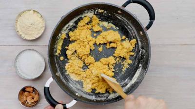 यासाठी तर सगळ्यात आधी गॅसवर कढई गरम करायला ठेवा. त्यामध्ये अर्धा किलो बेसन घालून ते भाजून घ्यायला सुरुवात करा. त्यानंतर पुढच्या एखाद्या मिनिटांतच त्यात साधारण २०० ग्रॅम तूप घाला आणि दोन्ही पदार्थ व्यवस्थित एकजीव करून मध्यम आचेवर ७ ते ८ मिनिटे भाजून घ्या. त्याला रंग थोडा चॉकलेटी पिवळसर व्हायला हवा.