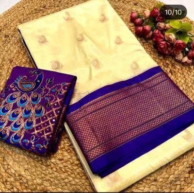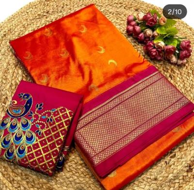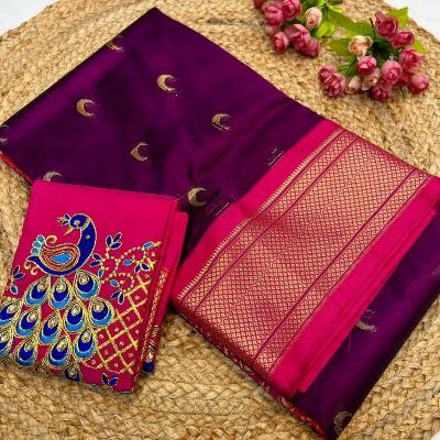 या पैठणीच्या पदरावर मोर, पोपट आणि कमळाच्या फुलांचे पारंपारिक विणकाम असते, जे साडीचा राजेशाही थाट अधिक सुंदर दिसतो.