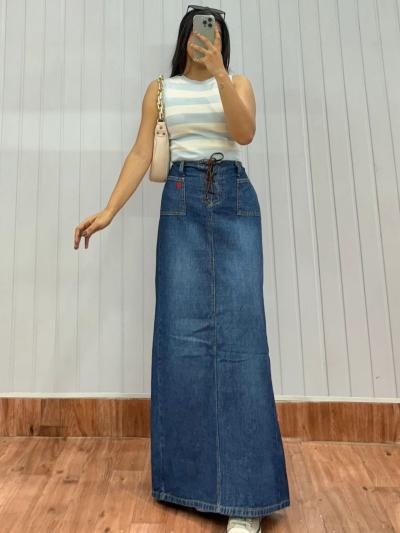 डेनिम स्कर्टसोबत प्लेन बटन डाऊन शर्ट आपण घालू शकतो. स्किनी बेल्टच्या लूकने परिपूर्ण करु शकतो.