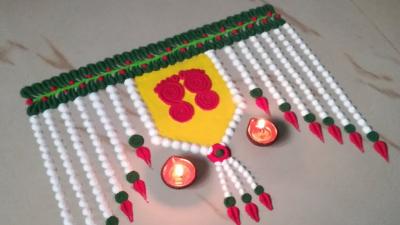 ३. एखादं छानसं तोरण वाटावं, अशा पद्धतीची ही एक सुंदर सोपी रांगोळी. काढायला तसा खूप वेळही लागणार नाही. मध्ये लक्ष्मीची पावलं असल्याने लक्ष्मीपुजनासाठी ही रांगोळी परफेक्ट ठरेल.