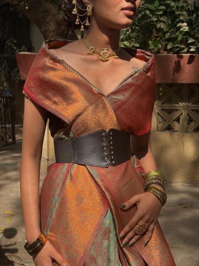बेल्टेड कॉर्सेट ब्लाऊज डिझाइनमध्ये मॅचिंग बेल्टचा वापर केला जातो. बेल्टमुळे आपल्या कंबरेला वेगळा आकार मिळतो. त्यामुळे साडीचा पदरही नीट राहतो आणि आपली फिगर Hourglass सारखी दिसते.
