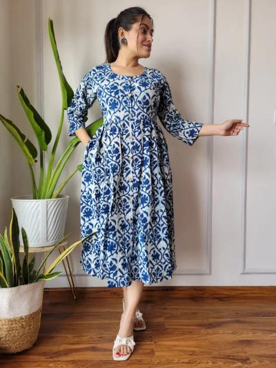 कॉटनचे नी लेंथ फ्रॉक्स ऑफिसवेअरसाठी किंवा वर्क फ्रॉम होम करण्याासाठी तसंच बाजारात जाण्यासाठी एक उत्तम कम्फर्टेबल पर्याय आहे.