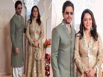 बॉलिवूड बादशहा शाहरुख खानची पत्नी गौरी खान हिने सोनेरी अनारकली सूट घातला होता. त्यावर तिने त्या सुटला शोभून दिसेल अशी फ्लेर्ड पँट घातली होती. हातातील बॅग, डायमंड नेकलेस, झुमक्या सोबतच हाय हिल्सच्या सँडल घालून तिने परफेक्ट लूक केला होता.