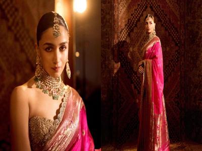 या लग्न सोहळ्यात आलिया भट्टच्या लूकची विशेष चर्चा होती, कारण तिने जी साडी नेसली होती, ती चक्क १६० वर्ष जुनी होती. आलिया भट्ट फुशिया गुलाबी सिल्क साडीमध्ये फारच सुंदर दिसत होती. यावेळी तिने प्रसिद्ध डिझायनर मनीष मल्होत्राच्या कलेक्शनमधील फ्युशिया पिंक आशावली सिल्क साडी नेसली होती. या साडीवर जरी वर्क केले होते, या साडीची बॉर्डर ९९ % शुद्ध चांदी आणि ६ ग्रॅम सोन्याने बनलेली होती. आलियाने या साडीला आधुनिक टच देण्यासाठी स्ट्रॅपलेस बस्टीअर ब्लाउज घातले होते. आलियाने तिचा लूक अधिक आकर्षक करण्यासाठी सोन्याचा आणि पाचूचा चोकर नेकलेस घातला होता. कानात झुमके, मांग टिक्का आणि बांगड्याही घातल्या होत्या.
