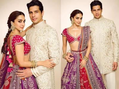 कियाराने या लग्न सोहळ्यात व्ही - नेक गुलाबी ब्लाऊज आणि त्यावर जांभळ्या रंगाचा भरजरी लेहेंगा परिधान केला आहे. तिच्या या लेहेंग्यावर चंदेरी धाग्यांनी केलेले बारीक नक्षीकाम फारच उठून दिसत आहे. या लेहेंग्याला साजेसा असा हेव्ही वर्क असणारा दुपट्टा देखील तिने घेतला आहे.