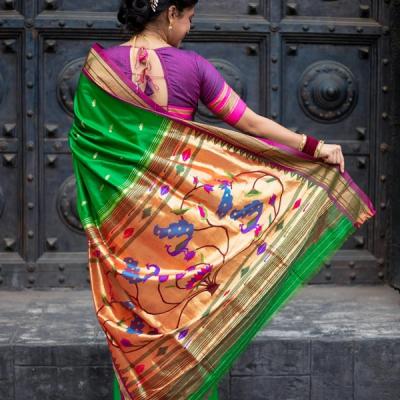पैठणीच्या बाह्या आणि साडीचा रंग जो आहे त्या रंगाचं ब्लाऊज असं कॉम्बिनेशन असणारे ब्लाऊजही पैठणीवर खूप मस्त दिसतं.