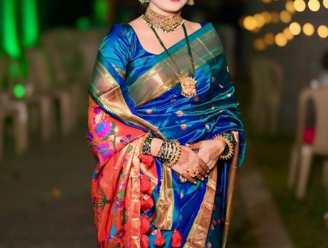 मोरपंखी हा पैठणीचा मूळ रंग मानला जातो. हिरव्या आणि निळ्या रंगाचे मिश्रण असलेला हा रंग आहे. (10 Morpkhi Paithani Pure Silk To Semi Silk)