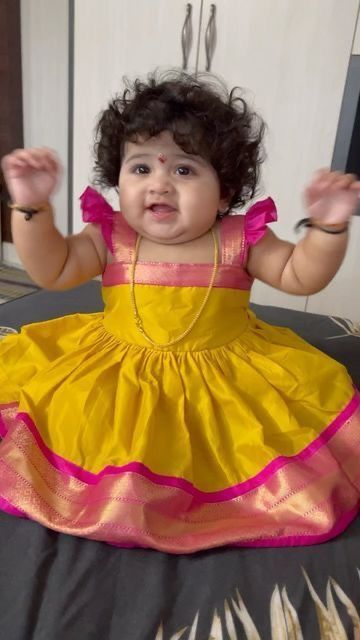 आपण साध्या साडीचा पिवळ्या रंगाचा फ्रॉक शिवून त्याला हिरव्या रंगाची बॉर्डर लावू शकतो. हा कॉन्ट्रास्ट मॅच होईल.