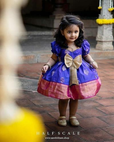 आपण जुन्या साडीचा सुंदर फ्रॉक शिवू शकतो. ज्यावर निळ्या रंगाचा बो लावू शकतो. ज्यात आपली लेक सुंदर दिसेल.