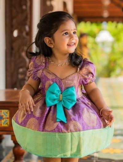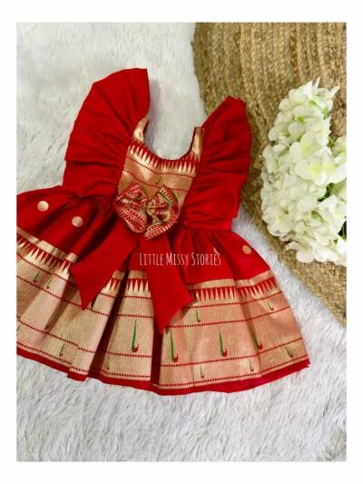 दिवाळीत पारंपरिकतेचा गोडवा हवा असेल तर लाल रंगाच्या पैठणीचा फ्रॉक आपण शिवू शकतो. त्याच रंगाचा बो लावल्यावर आणखी सुंदर दिसेल.