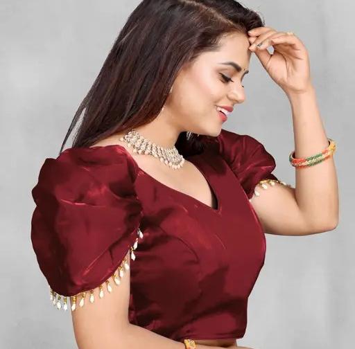 हा एक क्लासी आणि रॉयल ब्लाऊज पॅटर्न आहे जो ऑर्गेंजा साड्यांवर छान दिसतो.