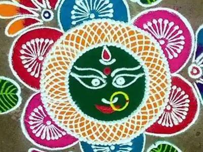 देवीचा चेहरा दिसेल अशी रांगोळी तुम्ही काढू शकता. पण त्यासाठी आधी खडूने आकार काढून घ्या नंतर त्यात रंग भरा.