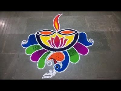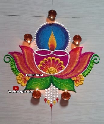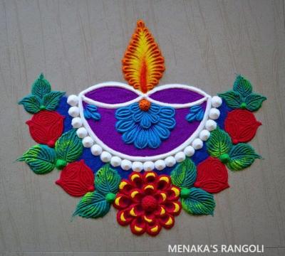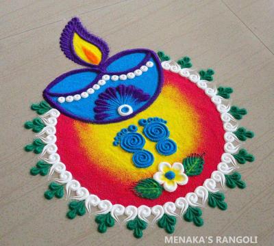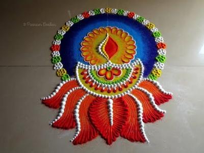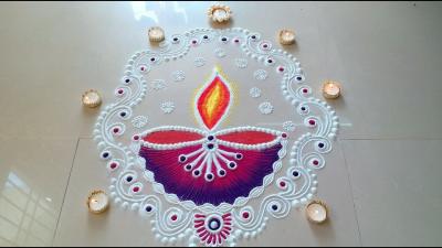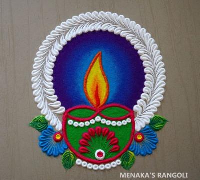 मध्ये दिवा आणि आजूबाजूला फुलांच्या डिजाईनचा सर्कल काढल्यास रांगोळी उठून दिसेल.