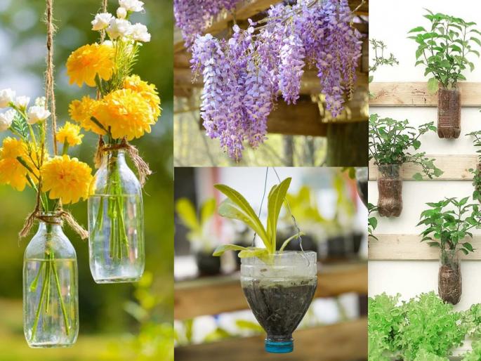 ८. पाणी, कोल्ड्रिंक अशा बाटल्या मधोमध कापा. खालच्या भागाला छान रंग द्या आणि त्यात अशा पद्धतीने छोटी छोटी झाडं लावून ती घराबाहेर, बाल्कनीत लटकवा.