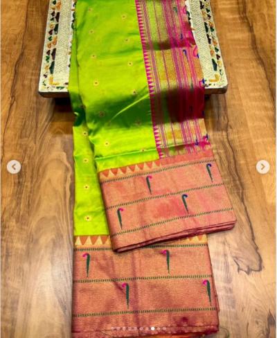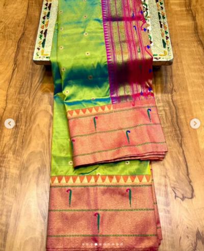 या साडीत पदरावर आणि काठावर पोपट आणि संपूर्ण साडीवर बुट्ट्यांची डिझाईन असते.