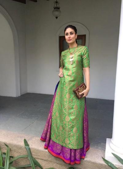 करिना कपूरचा हा वेगळ्या पॅटर्नचा ड्रेस पाहा. कॉन्ट्रास्ट रंग असणाऱ्या दोन साड्या वापरून तुम्ही अशा पद्धतीचा ड्रेस शिवून घेऊ शकता.
