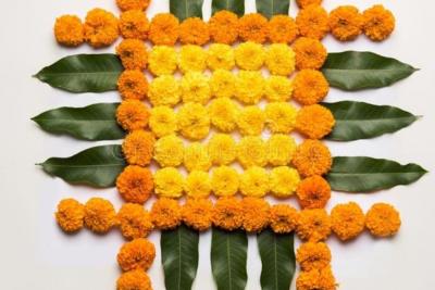 झेंडूची फुलं आणि आंब्याची पानं फक्त एवढंच साहित्य वापरून एकापेक्षा एक सुंदर डिझाईन्स काढता येतात.