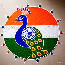 बॅकग्राऊंडला तिरंग्याचे रंग भरून वर निळ्या रंगाचा मोर काढल्यास रांगोळी उठून दिसेल.