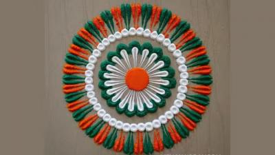अशोक चक्र” केंद्रबिंदू ठेवून बाहेरच्या रेषांत तिरंग्याचे रंग व फुलांच्या डिझाईन्स काढता येतील.