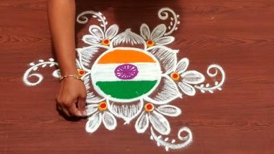 रांगोळीत भारताचा नकाशा काढू शकता. नकाशात तिरंग्याचे तीन रंग भरून बाजूला लाल किल्ला, ध्वज फडकवणारी आकृती काढा.