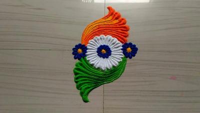 नारंगी, पांढरा, हिरवा या तीन पट्ट्यांची रांगोळी काढू शकता. पांढऱ्या पट्ट्यात मधोमध अशोक चक्र निळ्या रंगात. खाली “जय हिंद” किंवा “वंदे मातरम” लिहा