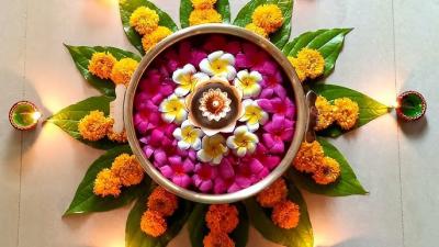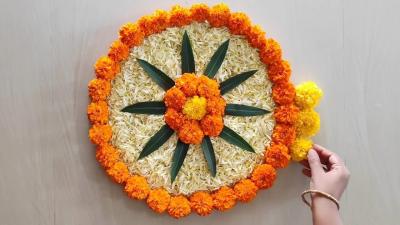 तुमच्याकडे कमळ, गुलाब, झेंडू, शेवंती अशी सगळीच फुलं भरपूर प्रमाणात असतील तर अशा पद्धतीचं छानसं डिझाईन काढू शकता.