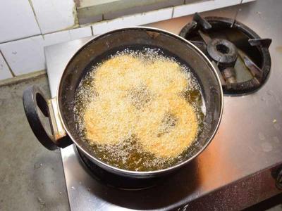 पदार्थ तळले गेल्यावर त्यांना लगेच झाऱ्यामध्ये काढून, कढईच्या कडेवर हलके दाबून त्यातील जास्तीचे तेल काढून घ्या.