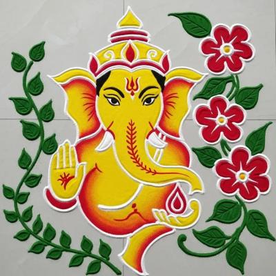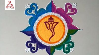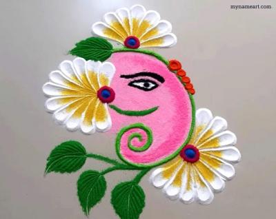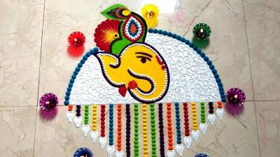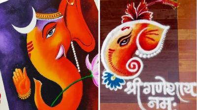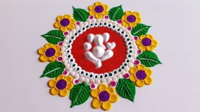 गणपती बाप्पांची सुंदर कलाकृती मध्यभागी आणि आजबाजूनं फुलांची रांगोळी काढू शकता.