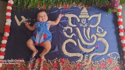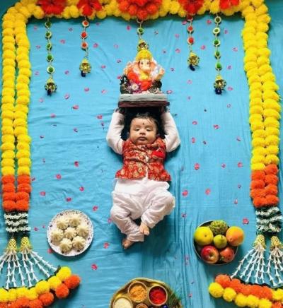 चिमुकल्याच्या डोक्यावर छोटीशी मुर्तीसुद्धा ठेवू शकता आणि आजूबाजूला मोदक, फुलांची सजावट करा.