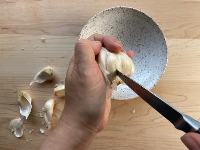 बऱ्याचदा आपण सालं काढण्याचा प्रयत्न करतो. पण खरी पकड मुळाशी असते. चाकूनं लसणाच्या मुळाकडचा भाग कापून टाका आणि मग साल ओढा. ज्यामुळे सालं सहज निघतील.