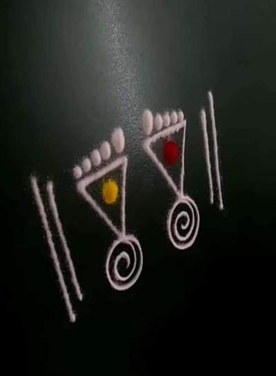 झटपट आणि कमी वेळेत काढायचे झाल्यास या काही पाऊलांचा विचारही तुम्ही करू शकता. ही पाऊलं काढण्यासाठीही तुमच्याकडे रांगोळीचे रंग असायलाच पाहिजेत असे काही नाही.