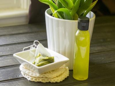 २ ग्रीन टी बॅग्ज किंवा २ चमचे ग्रीन टी पानं, २ चमचे एलोवेरा जेल, १ चमचा नारळाचं तेल
